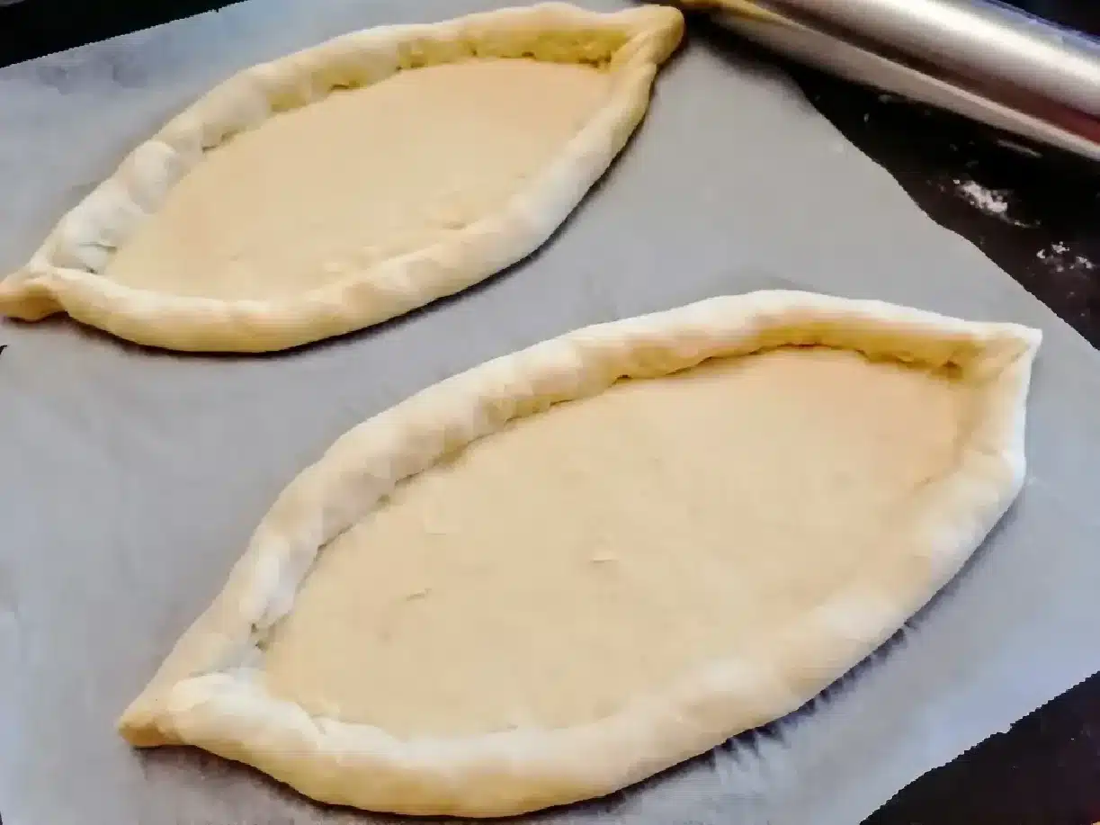 Okraje cesta naplníme strúhaným syrom (napr. eidam), okraje zrolujeme dovnútra a konce spojíme, čím vytvoríme typickú loďku z cesta.