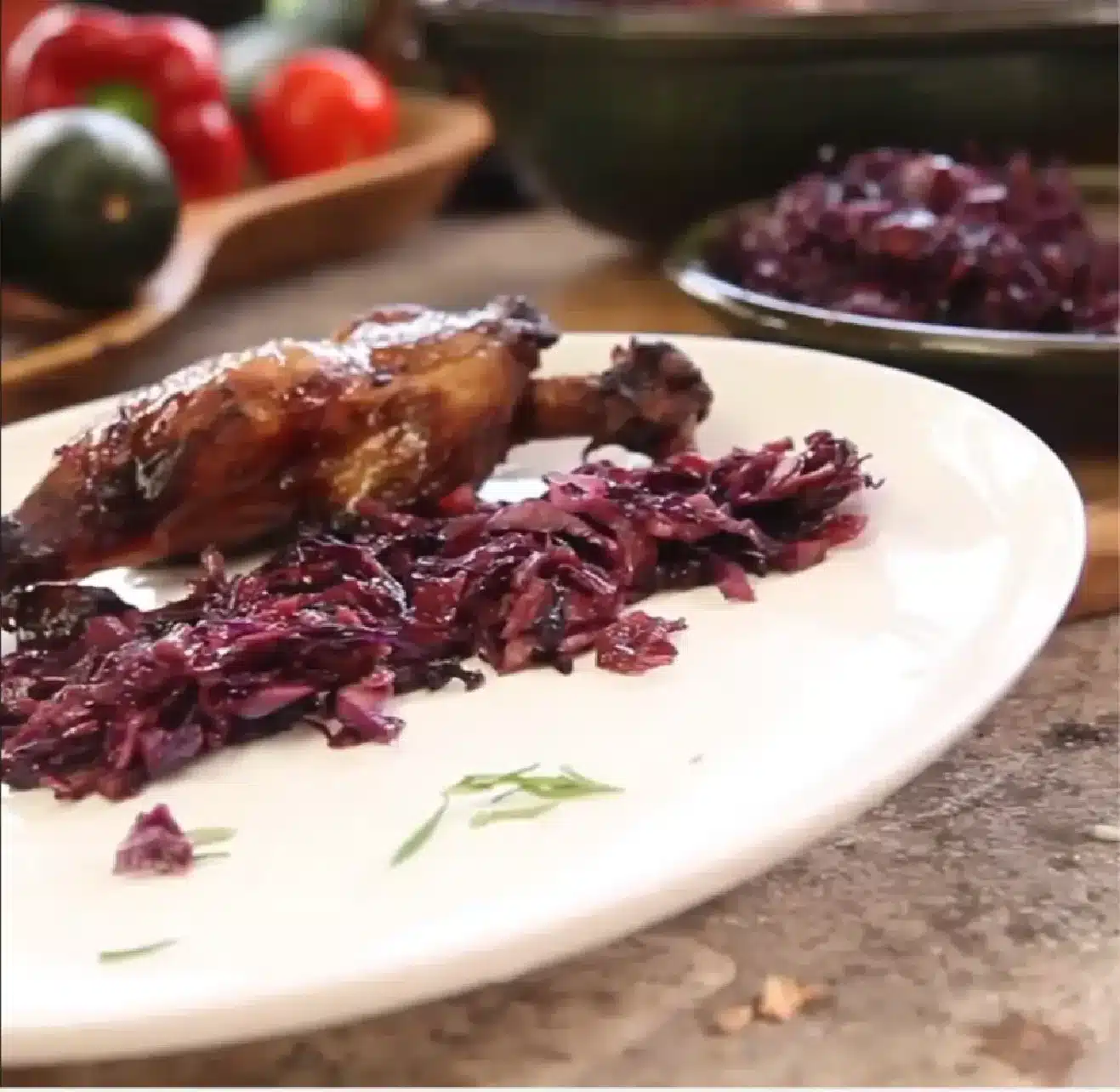 Hotové husacie stehno podávame s dusenou červenou kapustou a jablkami. Jedlo pripravené nad ohňom má výraznú chuť a príjemnú dymovú arómu.